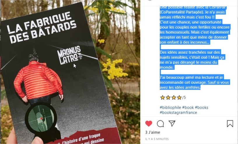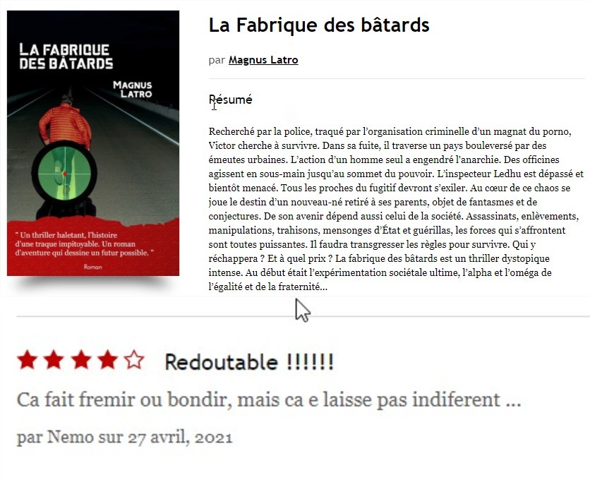 « Redoutable !!! A faire frémir ou bondir, c’est au choix. Impossible d’avoir un avis simple et tranché sur votre roman. L’écriture elle même est agréable, fluide et incisive. Ca pourrait se lire d’une traite sans problème. Un bon « page turner« .