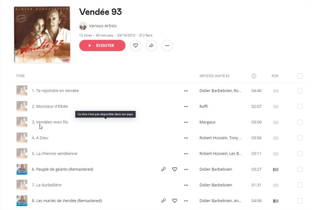 Vendéen mon fils, titre de l’album Vendée 93, de Didier Barbelivien est à l’index, censuré, banni des plateformes musicales, Deezer, Spotify et Apple music ! Vendéen mon fils, mais aussi Monsieur d’Elbée, Mourir à Ancenis, La Durbelière… C’est bien simple, sur les 12 morceaux du CD édité en 1992, il n’en reste plus que 3 à écouter en ligne. Les autres sont « indisponibles dans votre pays ».